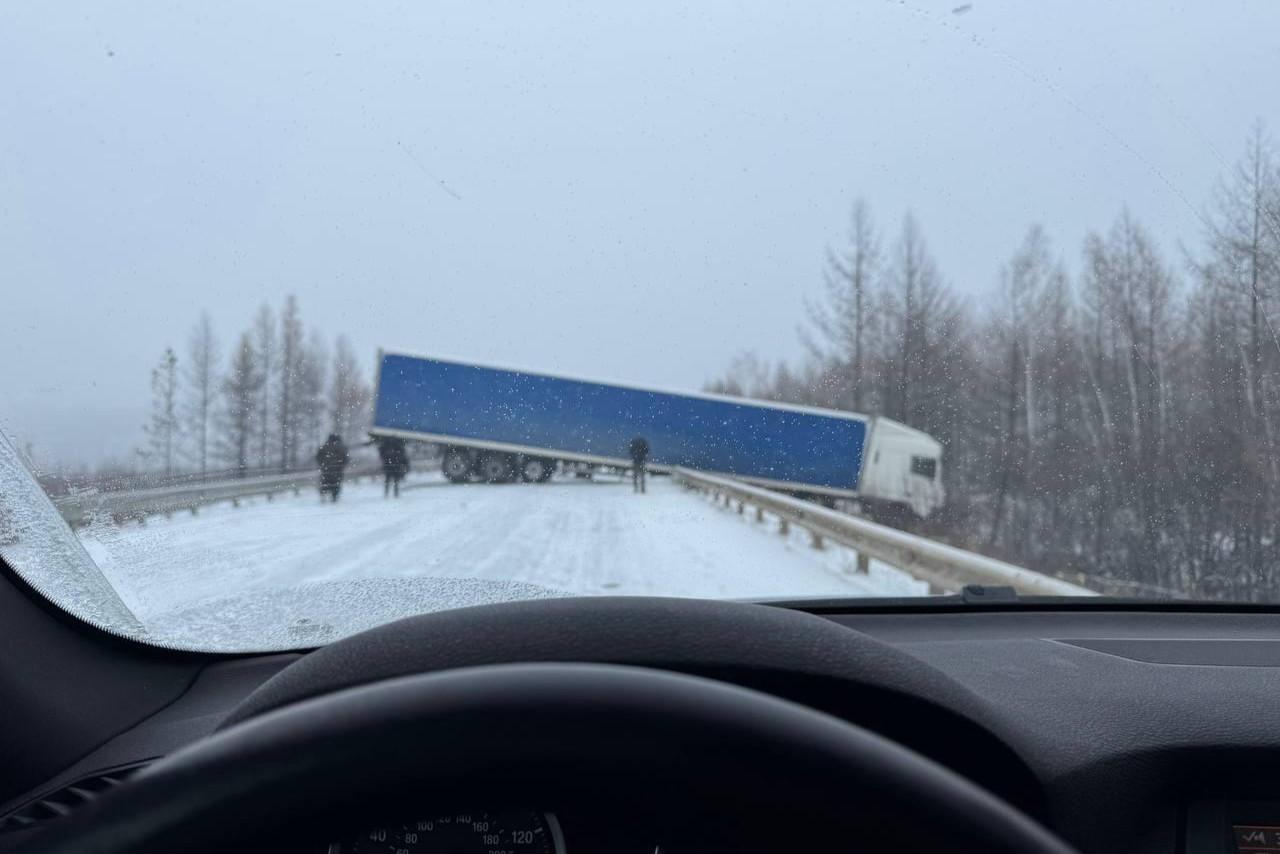 Фура слетела в кювет и полностью перекрыла собой трассу в ЗабайкальеСнежное «веселье» продолжается