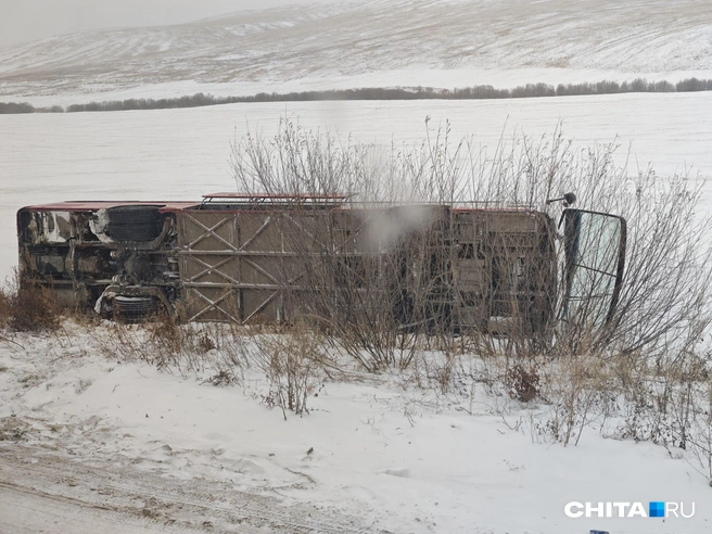 Автобус Kia Granbird с вахтовиками вылетел в кювет и перевернулся между селами Васильевка и Шилка в Шилкинском районе днем 15 ноября. Об этом корреспонденту «Чита.Ру» сообщил очевидец.