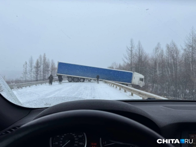 Фура вылетела в кювет и полностью перекрыла движение, встав поперек федеральной трассы Чита — Хабаровск, сообщают «Чита.Ру» очевидцы 15 ноября.