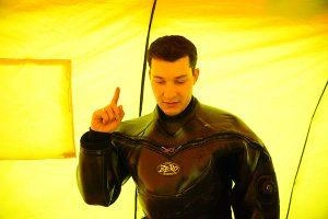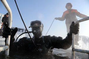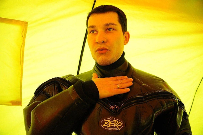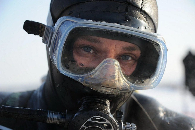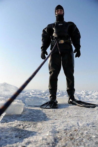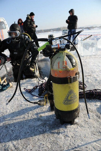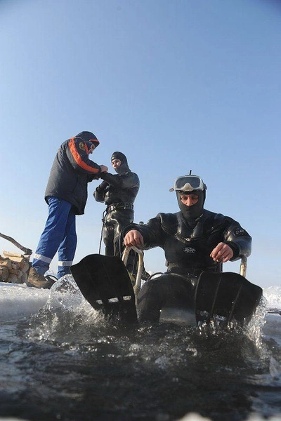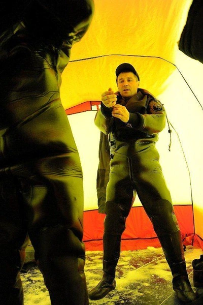 Около двух раз за зиму профессиональные водолазы собираются, чтобы провести учебно-тренировочные спуски под лёд озера Кенон. В разбитой на льду палатке поисково-спасательной службы края жарко топит установленная печурка, старшина водолазной станции Игорь Широков и спасатель-водолаз Анатолий Топчий с помощью спасателей герметично застёгивают карманы, через которые надеваются костюмы из неопрена.