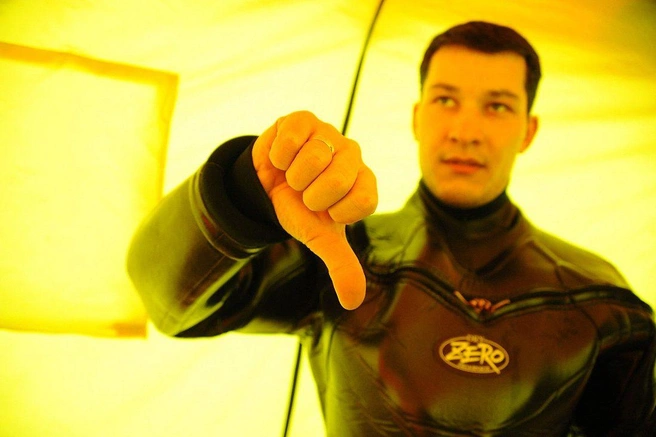 Анатолий знакомит нас с водолазной «азбукой»: большой палец вверх - подъём, вниз - погружение, вращение указательным пальцем у плеча - я что-то нашёл, ладонь у шеи - мне нехорошо и прочее.