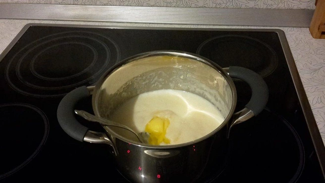 Кухня. Одной рукой включаю чайник, другой кастрюльку на плиту, пока закипает молоко, отмеряю крупу. Варю кашу. Сегодня манная. Добавляю топлёное масло, убавляю огонь и ставлю на таймер 5 минут пусть подойдёт.
