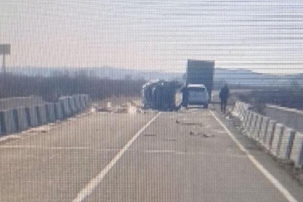 Фура и автокран столкнулись на трассе в Забайкалье — момент ДТП попал на видеоОт удара автокран перевернулся