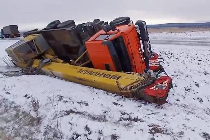 Фура и автокран столкнулись на трассе в Забайкалье — момент ДТП попал на видеоОт удара автокран перевернулся