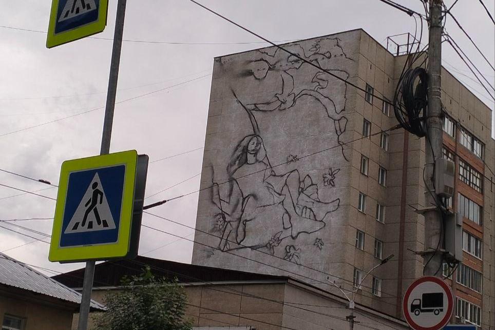 Девочка на качелях, багульник и синее небо. Мурал начали рисовать на стене дома в центре ЧитыТОС «Багульник» выиграло на это губернаторский грант