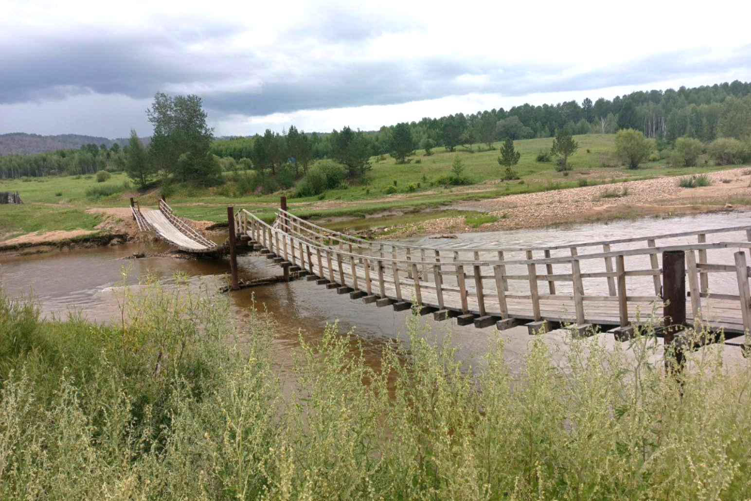 Мост повис. Жители села под Читой боятся переходить по нему через рекуЕго построили взамен снесенного водой в 2023 году